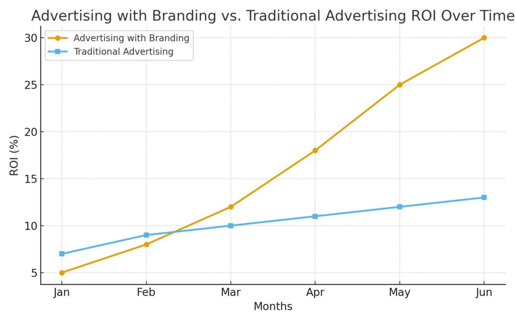 - Advertising with branding shows a steady and significant increase in ROI over time.
